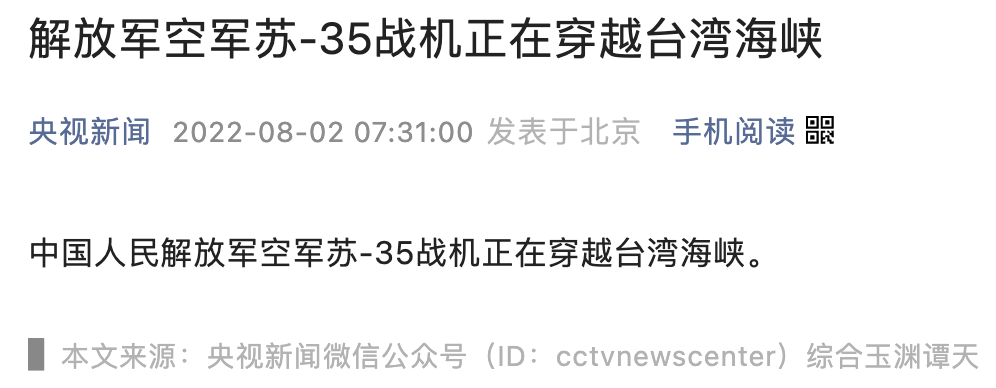 据央视新闻报道,中国人民解放军空军苏-35战机正在穿越台湾海峡。
