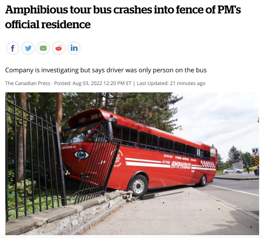 另一件令人感到蹊跷的事情,是同样在今天(8月3日)早上,大约9点,一辆水陆两栖旅游巴士撞上了 Sussex Drive 24号的围栏——这是特鲁多总理的官邸。
