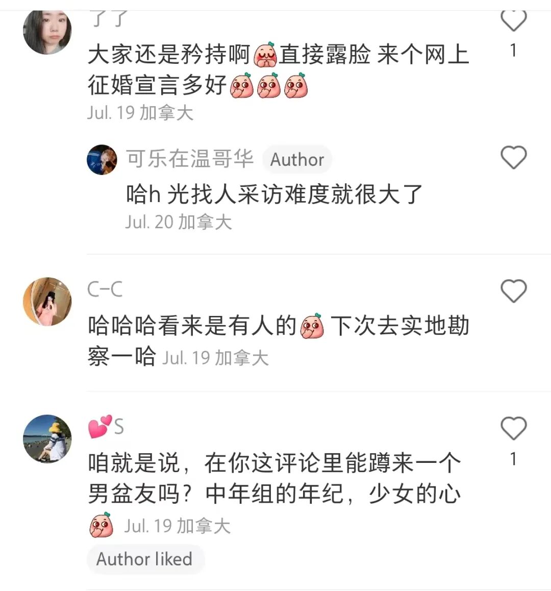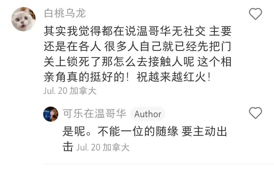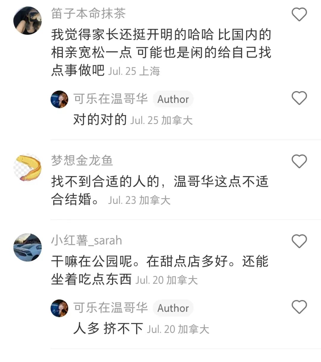 @可乐在温哥华的视频发出后,对此,喜欢的人激动地表示就该把相亲角开到全世界有中国人的地方!还有外地的小伙伴羡慕地留言:“多伦多也应该搞一个。”