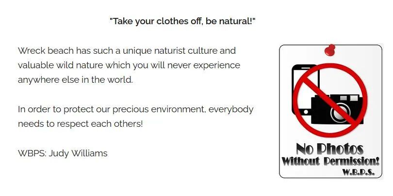 第一件就是,该海滩目前有个瑞克海滩保护协会(Wreck Beach Preservation Society)在负责管理,在它们的网站(https://www.wreckbeach.org/)入口就有个相机被打上“违禁”的标记,告诉你:此处禁止摄影。