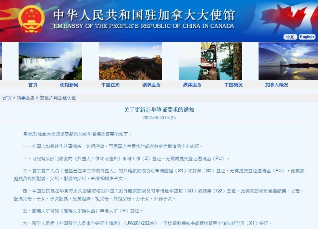 中国驻加拿大大使馆于8月20日,在官网上发布了最新的《关于更新赴华签证要求的通知》。跟之前6月20日发布的赴华签证要求相比,又有所放宽。