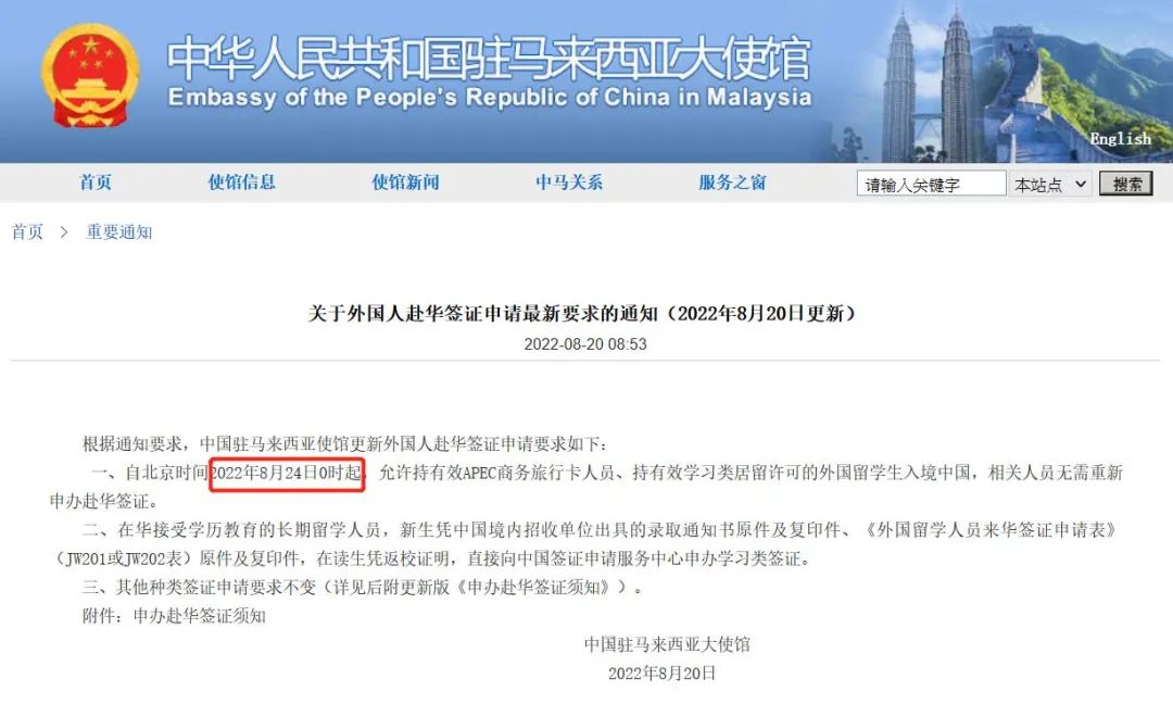 中国驻马来西亚大使馆则在官网上进一步提到,自北京时间2022年8月24日0时起,允许持有效APEC商务旅行卡人员、持有效学习类居留许可的外国留学生入境中国,相关人员无需重新申办赴华签证。