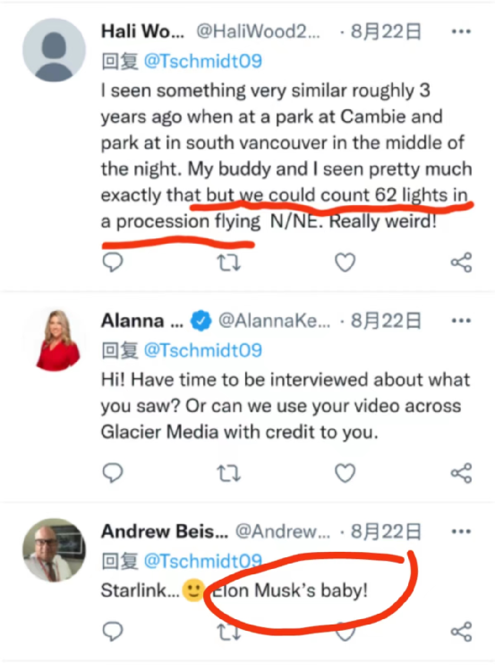 还有一位用户表示,大约在3年前的一个深夜,她在南温哥华的一个公园看到过与此非常相似的东西,“我和我的朋友们都看到了,我们可以清楚地数出62盏灯排成一队在飞行,真的很奇怪!”