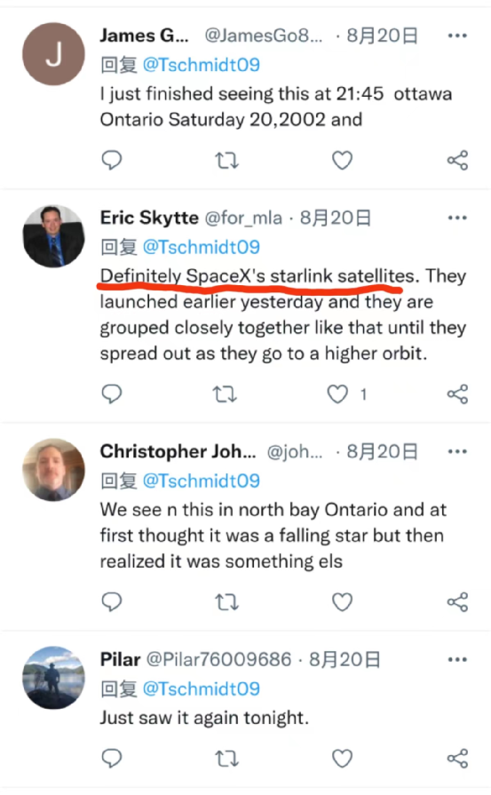另外一位用户回应说:“绝对是SpaceX的星链卫星,是昨天早些时候被发射的,它们就是会像这样紧密地组合在一起,直到进入更高的地球轨道时才会散开。”