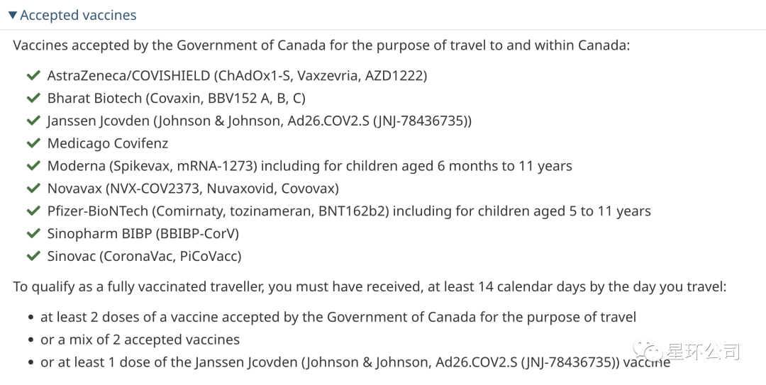 加拿大“完全接种疫苗”的定义:在入境加拿大14天前,已经接种2针以上的加拿大政府认可的疫苗。加拿大目前认可的疫苗如下,值得一提的是,中国的北京国药和科兴疫苗都已被加拿大认可,所以已完全接种这两类疫苗的国内朋友,可以放心入境。