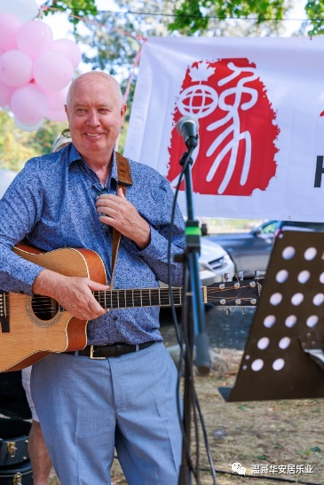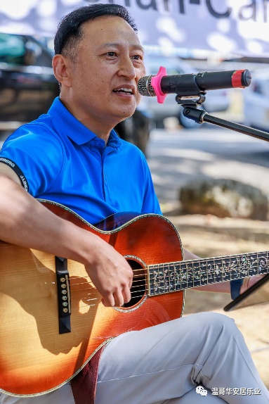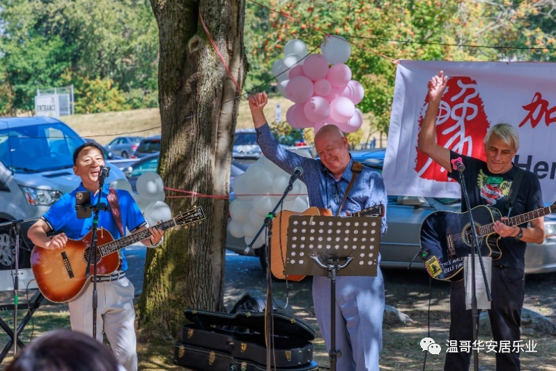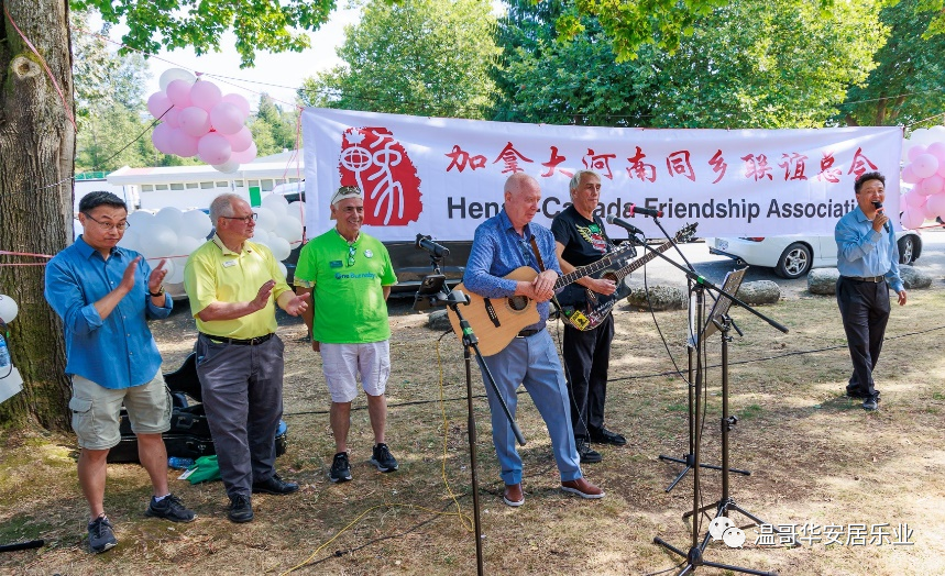 本拿比市长Mayor Mike Hurley与市议员Councillor Joe Keithley对大家说,听说今天是烧烤音乐会,所以不仅送来对乡亲们的祝福,还要代表本拿比市议会给现场的河南老乡们、给烧烤音乐会献上我们议员的节目,这就是我们刚才所倡导的“多元文化”,说着两人就开始了吉他弹唱。一曲完毕,现场欢声雷动,掌声四起,台下的嘉宾和老乡们也纷纷跑到到场地中间尽情伴舞,合影照相。