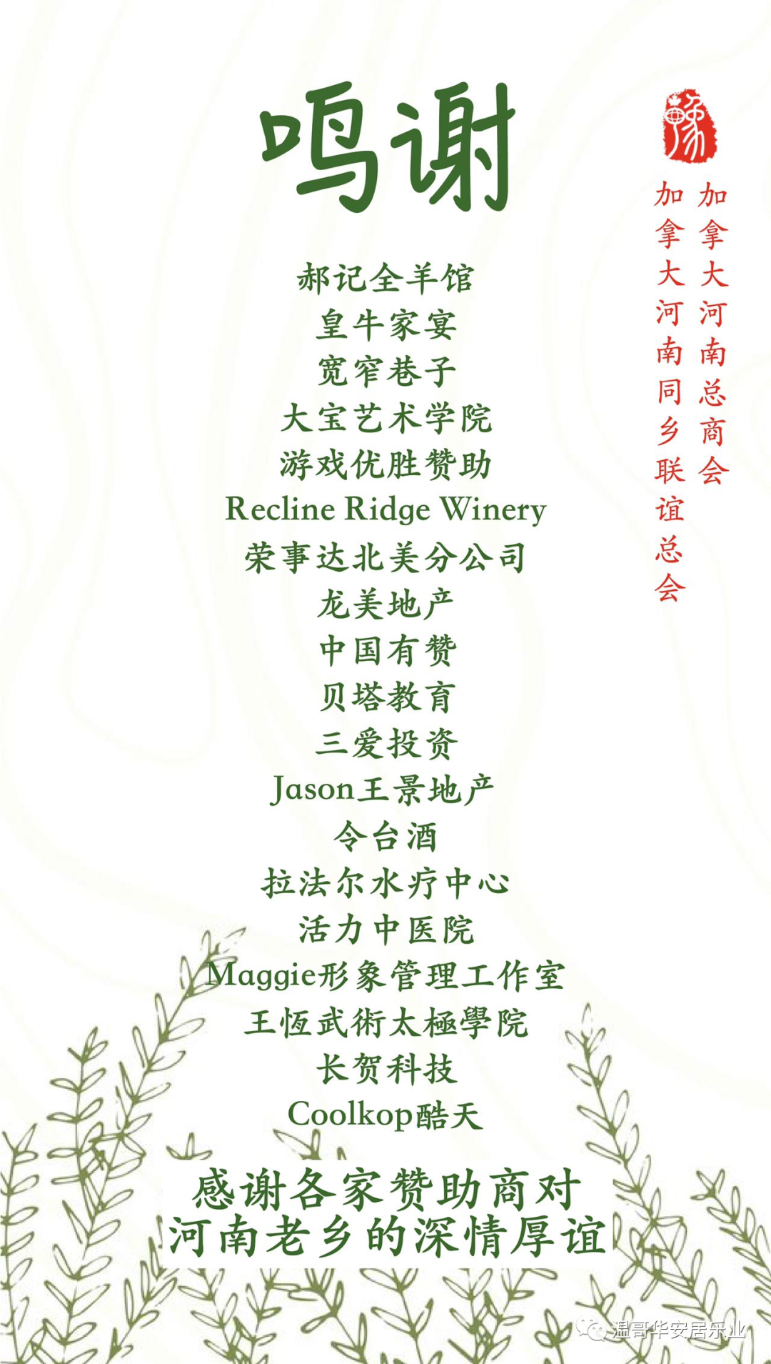 为了保证河南老乡们吃好喝好玩好,总会理事长杨东伟热心捐献$3500,会长张智勇捐献$3500,副理事长王向东捐献$2000,董事及顾问付明安捐献$2000、总商会会长张华友捐献$2000、总商会秘书长许斌捐献$2000,副会长郝正文捐献$1000,副会长水莹捐献$1000。