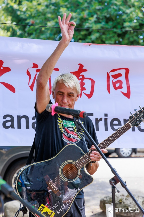 本拿比市长Mayor Mike Hurley又邀请加拿大河南同乡联谊总会会长张智勇登场,三人一起联袂,用中英文弹唱一首大家耳熟能详的《红河谷》,观众也随着旋律打拍子,一起鼓掌。最后一曲,由总会会长张智勇演唱的英文歌曲 Take me home, country roads,《乡村路带我回家》, 引起大家强烈共鸣,全场一起大合唱,掀起了烧烤音乐会的高潮。