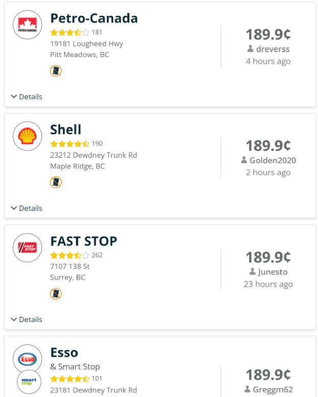 从今日价格上看,油价普遍维持在每升1.9加元左右。以下是今日大温地区燃油价格最便宜的10家加油站,有需要的朋友可以前往以下地点加油: