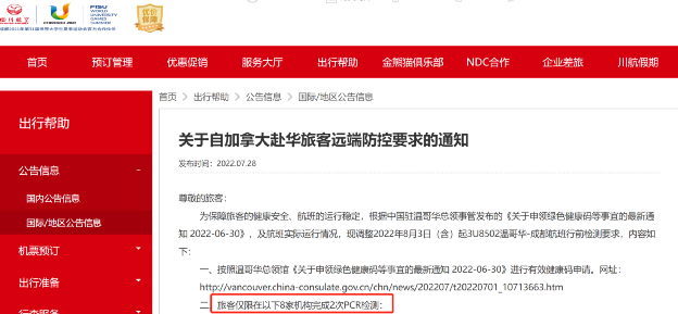 9月1日,中国国际航空公司特意发出了《关于提醒搭乘加拿大赴华航班旅客关注最新乘机要求的温馨提示》,对9月8日起加拿大飞往中国的旅客核酸检测做出了新规定。