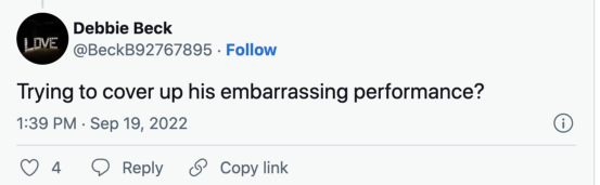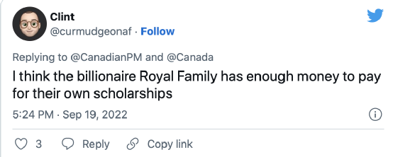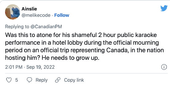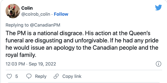 还有网友直接在推特上@总理办公室发表评论,“这个总理是国家的羞耻,他在女王葬礼期间的所做所为是恶心的、难以原谅的,如果他还有点尊严的话,应该正式向加拿大人民和英国王室道歉。”