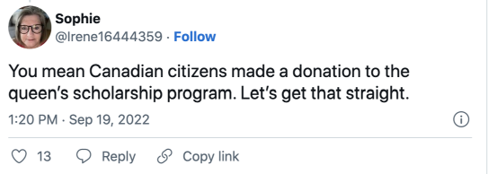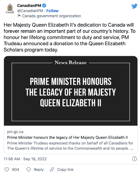 在伊丽莎白女王举行国葬的当天,加拿大总理贾斯汀·特鲁多宣布,加拿大将向伊丽莎白女王的奖学金计划捐赠2000万加元,昨天中午,总理办公室通过推特发布了关于通过捐赠以纪念伊丽莎白二世女王的新闻稿。