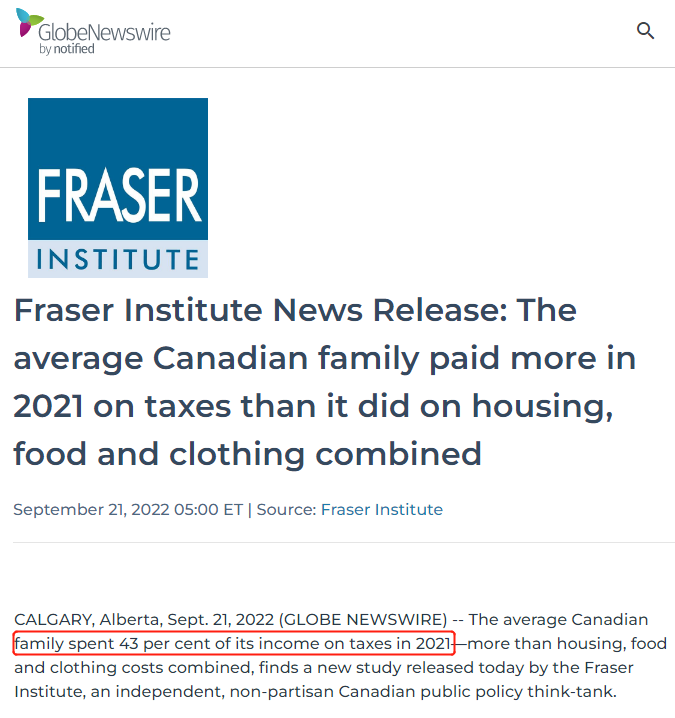 2、加拿大家庭在2021年平均缴税42547加元,占收入比重高达43%。