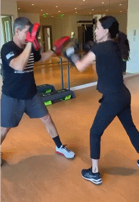 年近60岁的她,玩起这种需要体力支撑的拳击,也是不在话下。