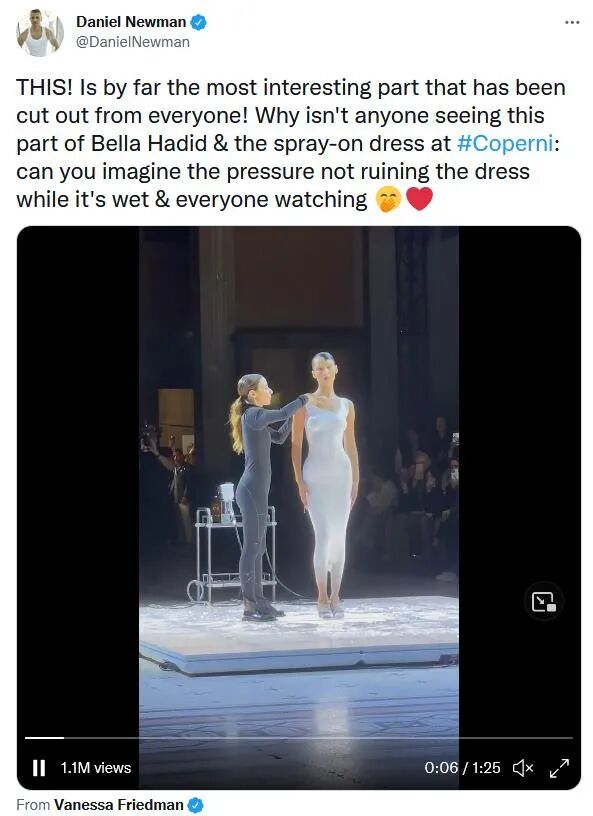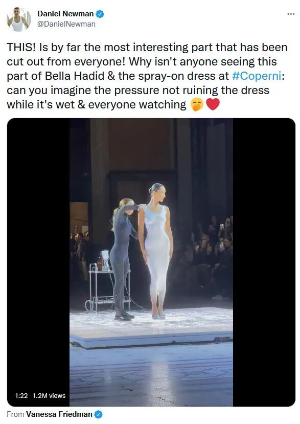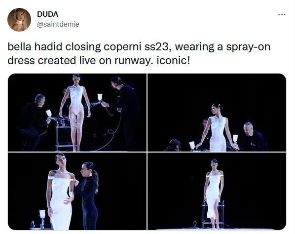 有网友大赞哈蒂德成为主导品牌Coperni在时尚秀中最重要的一刻。