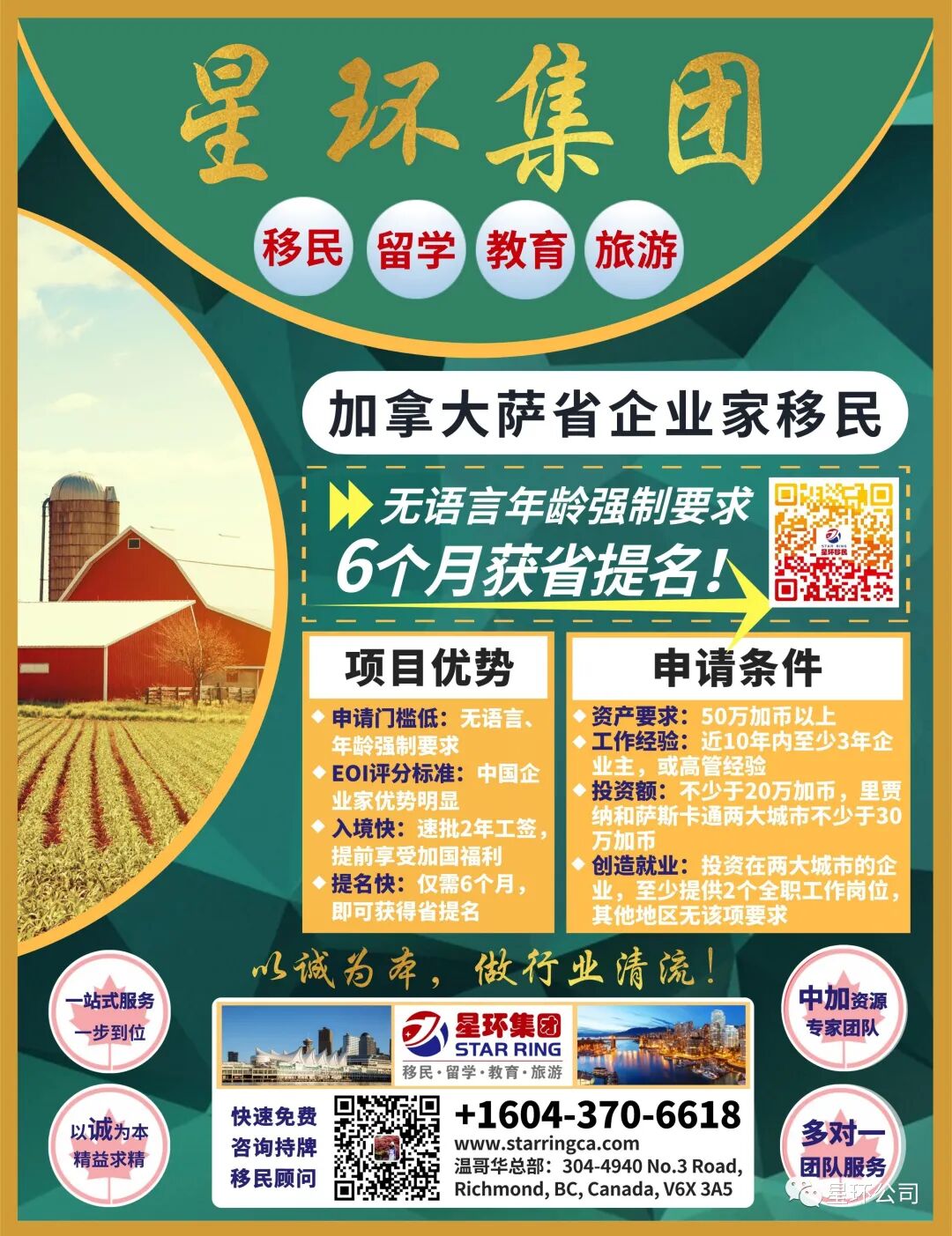 乍看之下,无语言、年龄偏大、资金有限,好像没有可以申请的投资移民项目,但实际上还真有一个专门针对这类型申请人的移民项目,那就是星环多年来一直在做的——「萨省企业家移民」(SNIP-EI)。