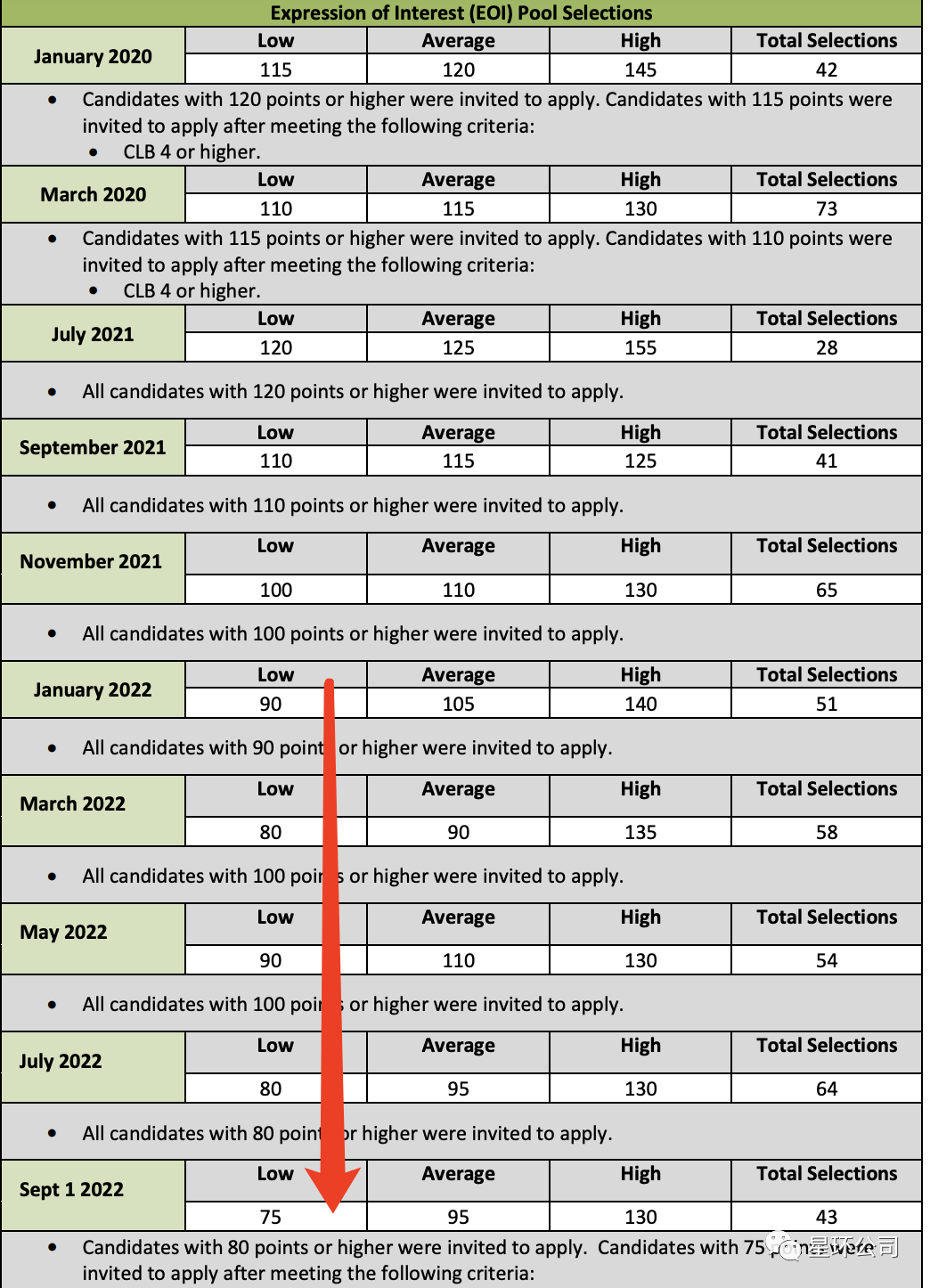 更加令人开心的消息,2022年「萨省企业家移民」的EOI邀请分数一直呈现走低趋势。在9月1日抽选的时候,更是出现了75分的低分!