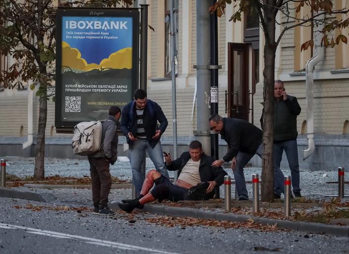 基辅街上可以看到居民的衣服和手上沾满了血。一名身穿蓝色夹克的年轻人坐在地上,一名医生用绷带缠住他的头。一个头上缠着绷带的女人,上衣前襟全是血。几辆汽车也被损坏或完全摧毁。空袭警报在乌克兰全国和基辅反复响起。