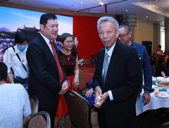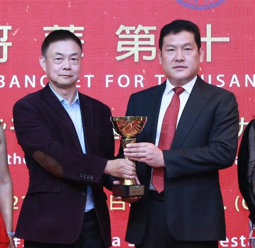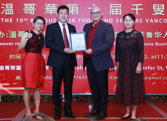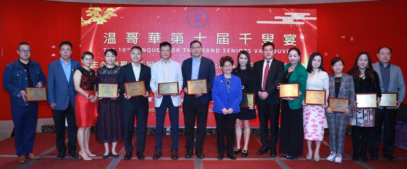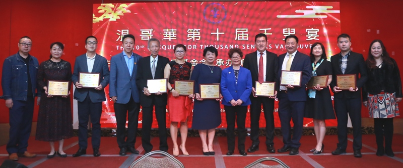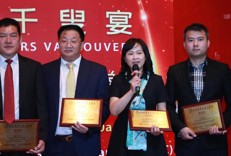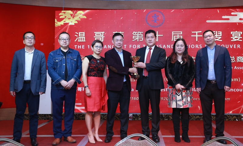 宴会开始,第九届温哥华千叟宴执行主席吕露首先把千叟宴金杯郑重转交给第十届温哥华千叟宴执行主席刘朝方。在现场的历任执行主席们也一起上台合影。