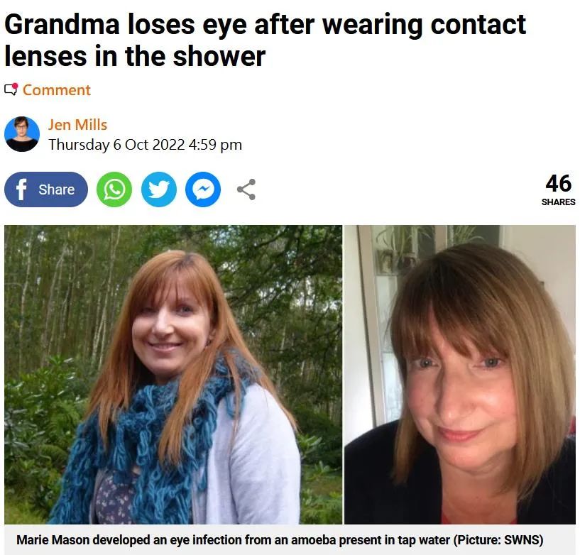 就直白说了吧,洗澡时一定要取出来,英国1名女子洗澡时戴着可重复使用的隐形眼镜,结果,被阿米巴变形虫入侵,最后,只能把眼球给摘了。