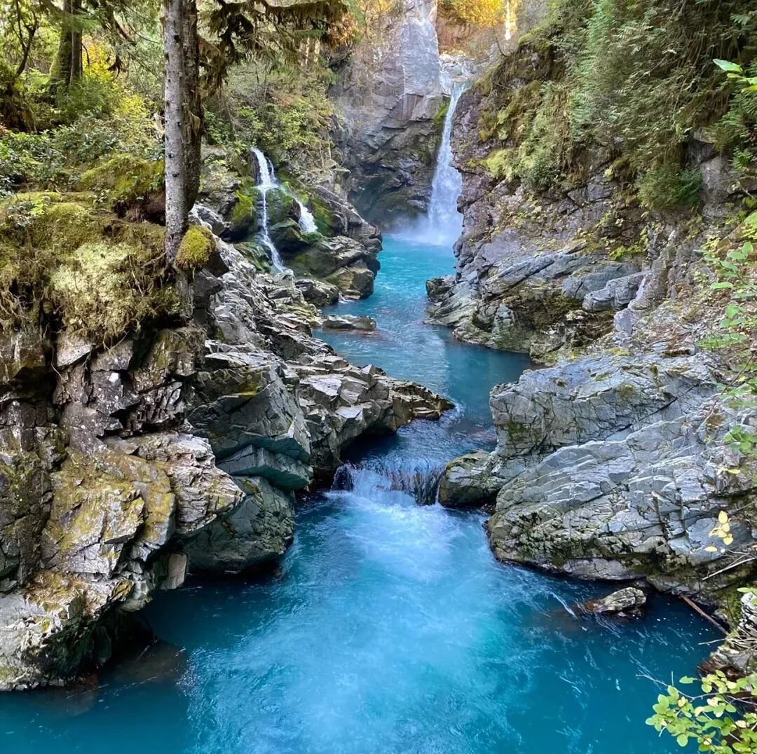 森林里有参天古树、小溪潺潺;阳光透过的树叶零星点点,显得格外浪漫;冰川的水蓝得出奇实在太美!