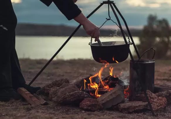 大家正围坐在篝火旁,在夜幕下品尝佳肴;