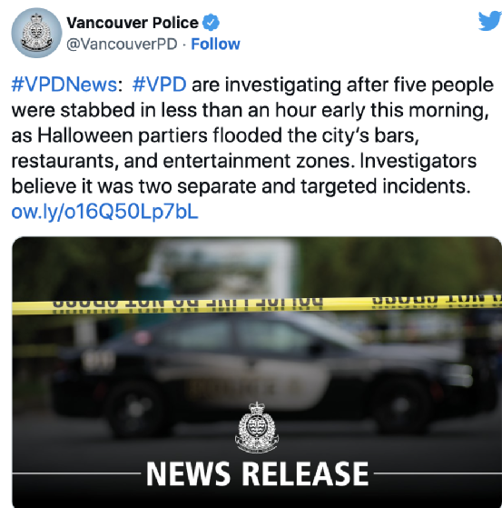 因为万圣节大量参加派对的人涌入了温哥华城的酒吧、餐馆和娱乐区。周日凌晨,间隔不到一个小时,就有五人被刺伤。