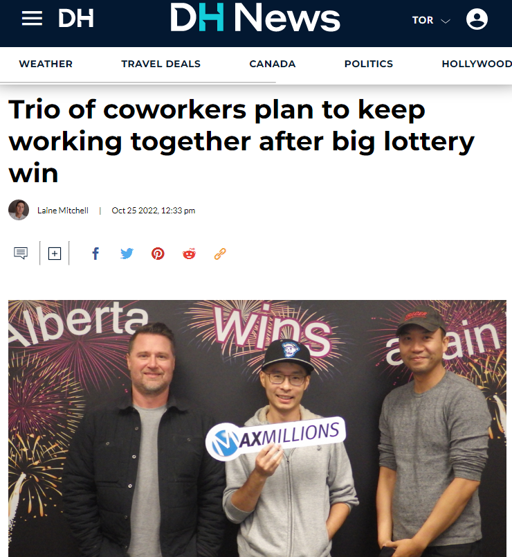 加拿大华人和同事合伙买彩票中了个大奖!3人都准备继续工作不辞职2022-11-01 |作者:超级生活 | 来源:温哥华头条温哥华头条Loading...分享:#加拿大#华人#彩票 最近合伙买彩票中奖的事儿可真多。 就在本月早些时候,加拿大有华人和同事合伙买彩票中了个大奖。 埃德蒙顿的周先生(音译:Kevin Chow)、范先生(音译:Don Pham)、和麦金尼斯先生(音译:Kevin McInnes)表示,他们在 10 月 11 日 Lotto Max公布抽签结果的第二天,激动到没法专心工作。因为他们中奖了! 范说,“那天知道中奖后,我实际上整天都在开会,我必须集中注意力,有点难。” 这3人组去加拿大西部彩票公司(WCLC)领奖中心领取他们的$100 万奖金时表示,他们计划在赢奖之后还是继续工作和合作。 周先生是通过网上查看号码时发现了他们的胜利,并立即给其他人发短信。有意思额是,他们三人当时决定在工作中对他们的巨大胜利消息保密。 “那是漫长的一天,”周先生补充道。 这组工作同事表示,虽然他们每人拿到的 $333,333 的份额不一定足以退休,准备继续工作,但他们表示想休个假。 “我们今年本来不打算休假,但现在我们绝对可以,”麦金尼斯说。 “我可能会将其中的一部分用于还房贷,其余的将存起来,我是一个非常负责任的成年人,”范先生补充道。 他们的中奖彩票是在抽签前几个小时,在埃德蒙顿位于 14110 127th Street North West 的 7-11便利店购买的。 自 8 月以来,这3人的彩票是 19 名赢得加拿大西部 Maxmillions 大奖的获奖者一。 该地区售出的另外三张门票与其他门票平分奖金 $500,000。 “太神奇了,”周先生感叹, “哪怕来到这里领奖也是一种狂野的感觉。” “我一直在发呆,好像在做梦一样,”麦金尼斯补充道。“你有点想知道你什么时候会醒来。” 这3个同事运气也太好了!祝大家都有好运。 阅读 未经允许不得转载:加拿大乐活网 »加拿大华人和同事合伙买彩票中了个大奖!3人都准备继续工作不辞职分享: