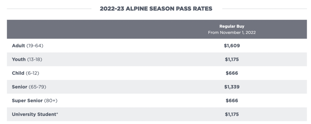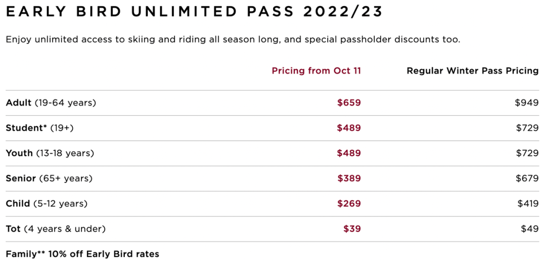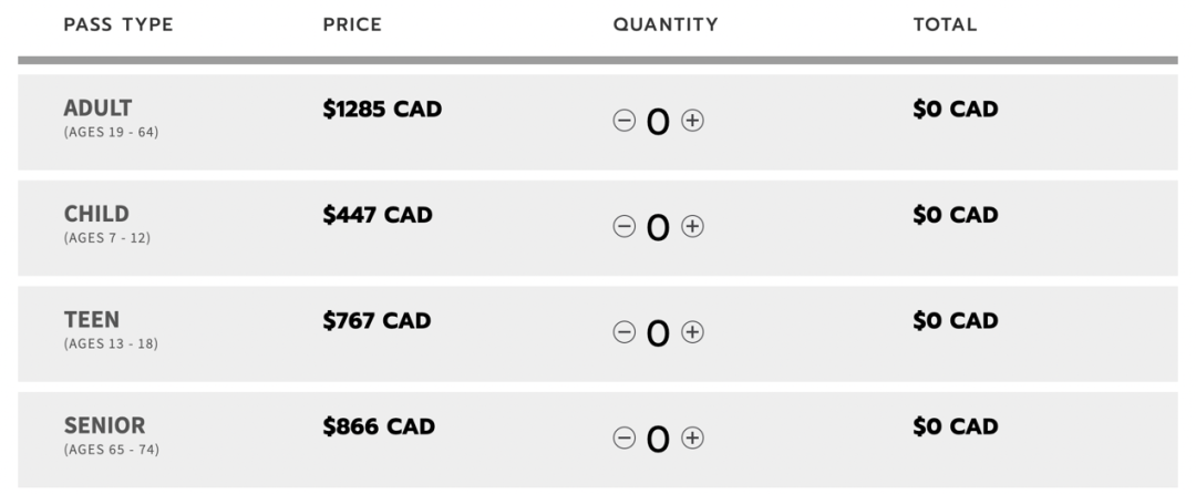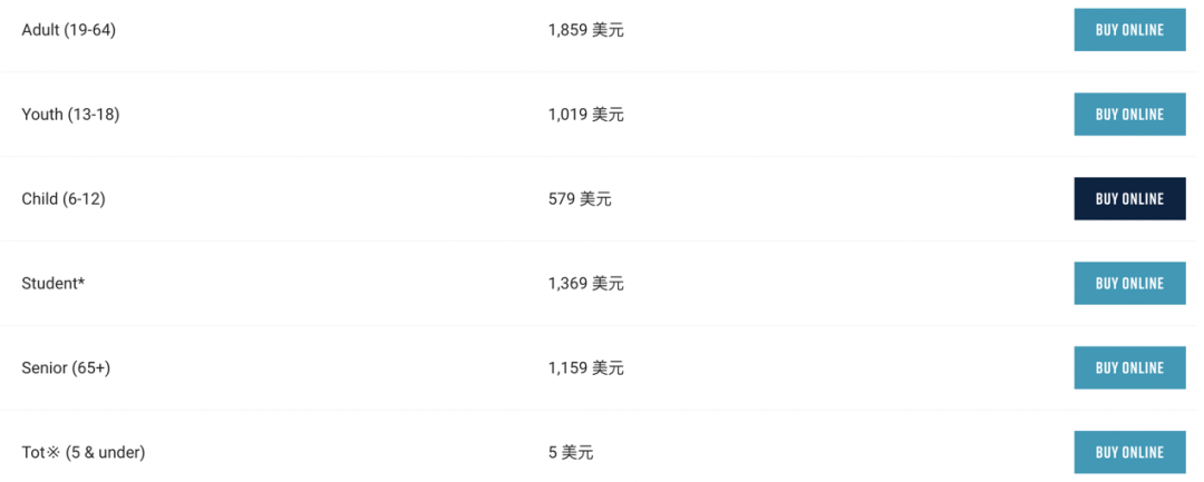 惠斯勒今年的无限次季票,成人价格$1285 CAD;儿童价格$447 CAD;青少年$767 CAD;老年人$866 CAD。具体如下: