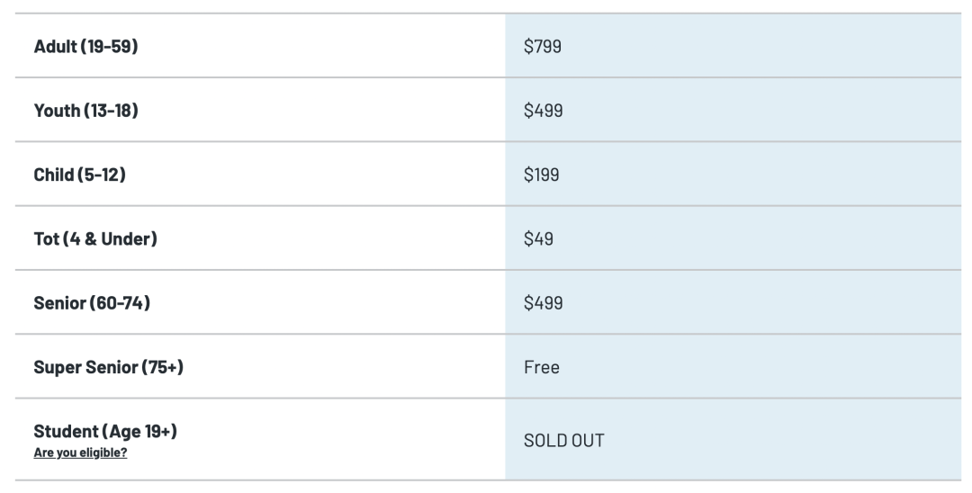 季票价格如下。遗憾的是,今年的优惠期已经结束,只能按照原价购买了。