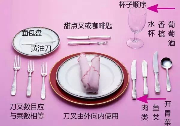 10、在正规的西餐中,餐具一般如下图这样摆放,各种刀叉、勺子和酒杯的用途不一,注意不要用错。