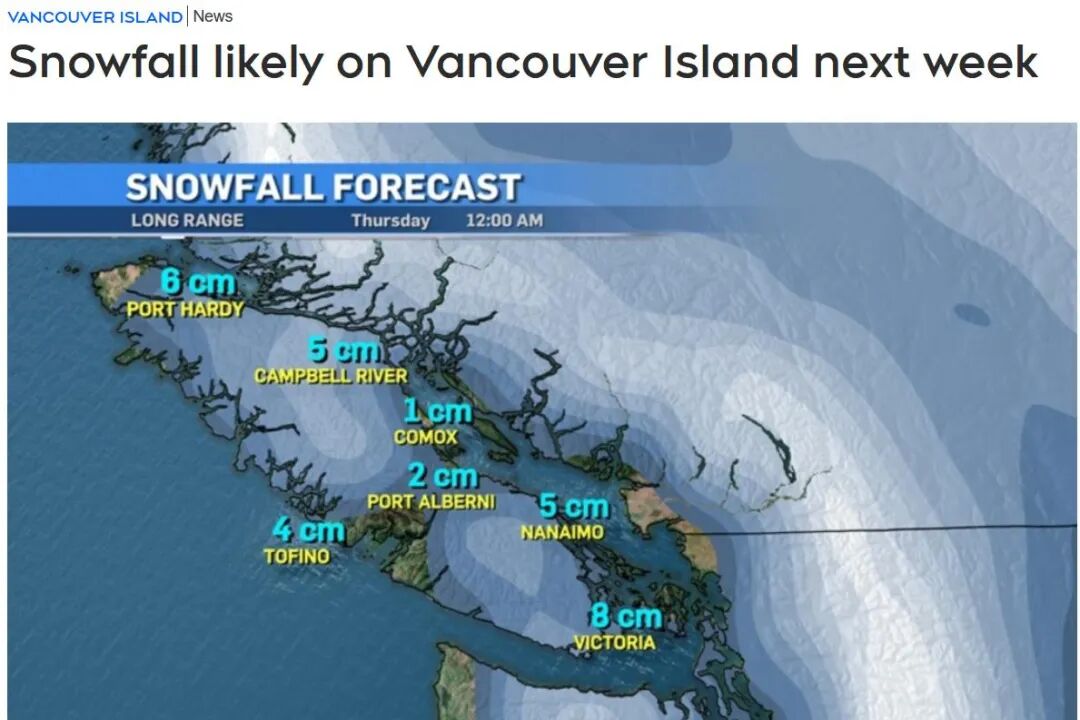 目前很难算出降雪量,但下周二和周三,大维多利亚的 Comox 地区,大概会有 1 厘米到 8 厘米左右的降雪。