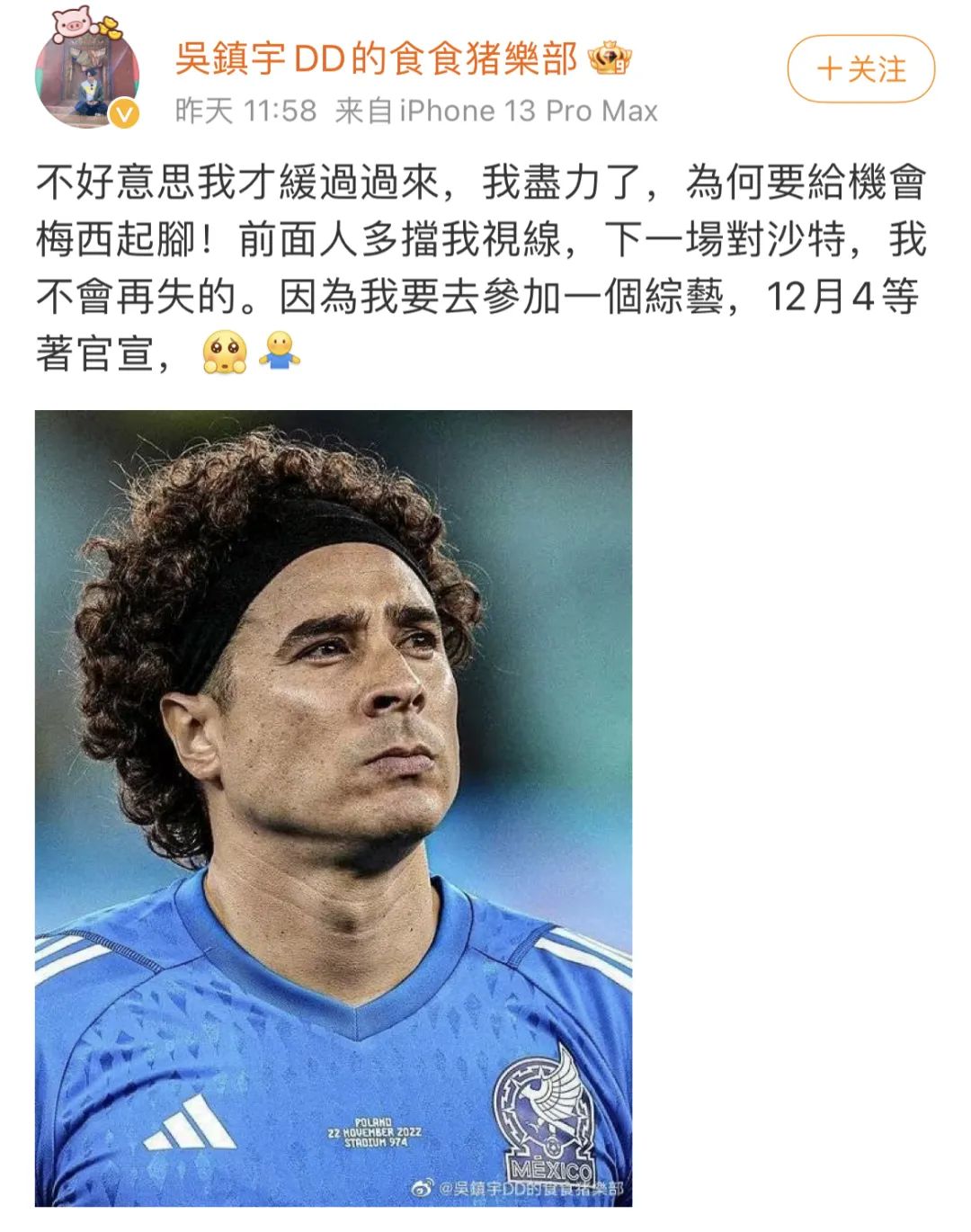 在11月27日世界杯小组赛第2轮,阿根廷2-0取胜墨西哥后,吴镇宇也紧随热点,在微博上晒出墨西哥门将奥乔亚的照片,并反思“自己”被梅西进球的原因