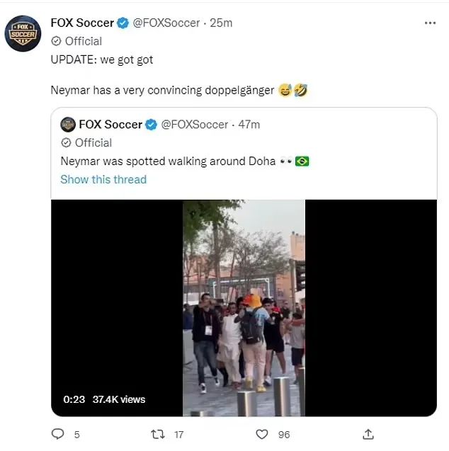 不得不说,这个高仿内马尔和内马尔真的太像了,以至于前两天他出现在多哈街头的照片甚至还“骗”过了外媒,最后外媒不得不更新称,“内马尔有一个真的很像他的二重身啊”↓