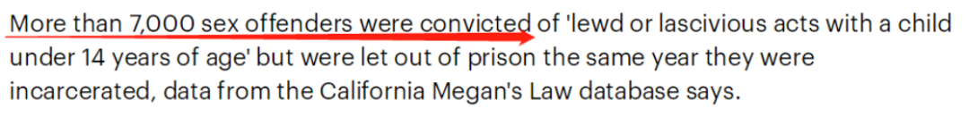 根据加州梅根法律(California Megan’s Law)数据库的数据显示,超过7,000名性犯罪者因对14岁以下儿童(其中包括为数不少的男童)发生猥亵或实施性行为(性侵)而被定罪,但他们均在被监禁的同一年被释放出狱。