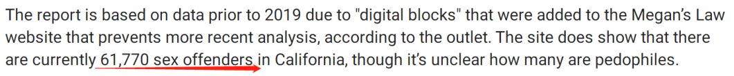 加州梅根法律(California Megan’s Law)网站显示,目前加州有61,770名性犯罪者,但尚不清楚其中有多少是儿童性犯罪者。