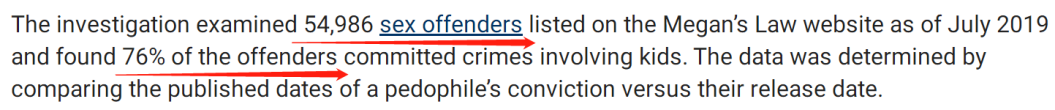 该网站调查了截至2019年7月所列出的54,986名性犯罪者,发现有41,794人,也就是约76%的性犯罪者涉及儿童。