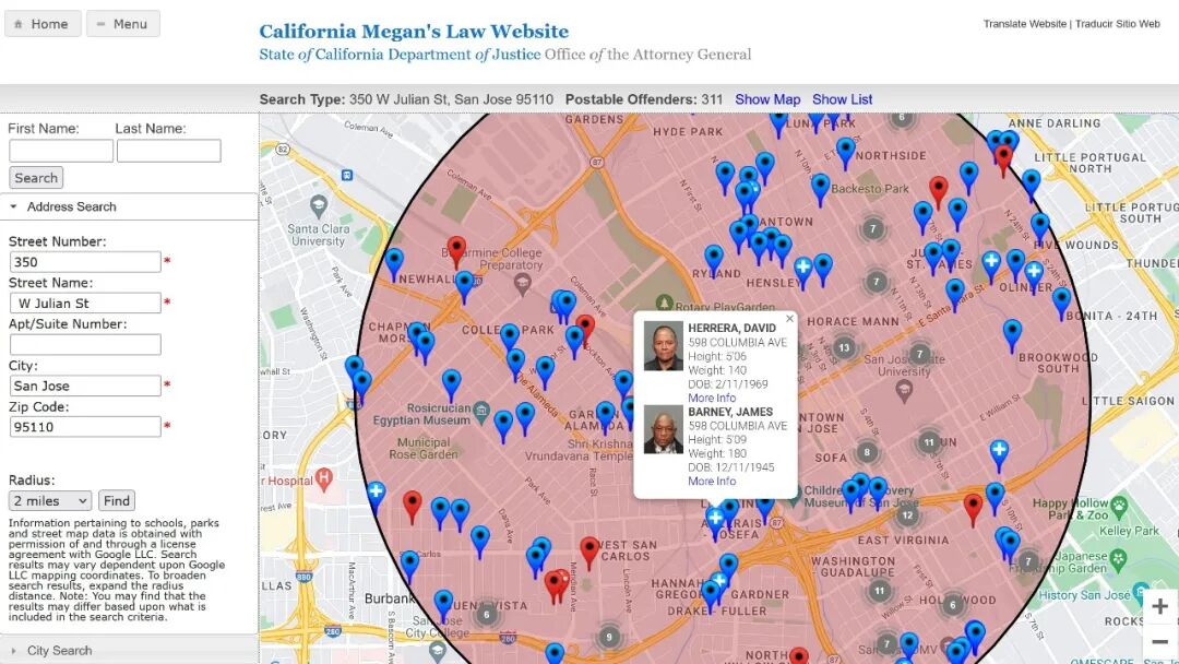 加州的梅根法律网站,www.meganslaw.ca.gov允许任何人进入搜索性侵犯者,详细信息包括姓名、年龄、住所、罪行、面部照片以及他们最后一次被定罪和出狱的日期。