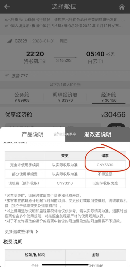 有网友晒出自己购买的美国飞广州的机票,四万的经济舱已经够让人肉疼的了,眼下想要退票还得再倒贴近一万四。