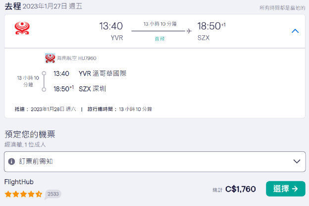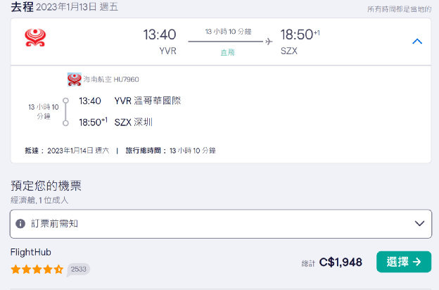 海南航空HU7960 1月13日 温哥华-深圳,票价$1948加元;