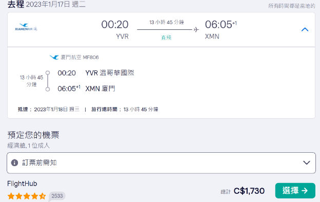 厦门航空MF806 1月17日温哥华-厦门,票价$1730加元;