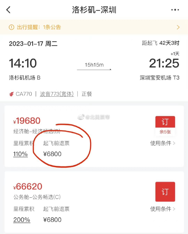 这就很尴尬了。退票费是迅速恢复了,但大多数机票并没有恢复到疫情前水平。这就导致飞国际航班的旅客,如果行程有变想退票,动辄要付出几千,甚至上万的费用。