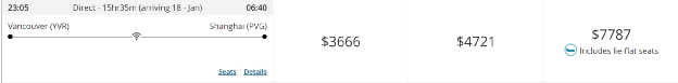 相比之下,加拿大航空两列直飞航班的价格就有点高得过分了。整个一月,加航直飞中国的航班最低价格为1月16日温哥华飞上海的航班。该航班号为AC025,票价为$3666加元起,直接是中国航司的两倍了。