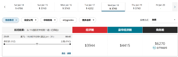 加拿大东部地区多伦多出发回国的航班中,多伦多直飞上海的AC027航班在1月15、16和18日价格最低,均为3743加元。