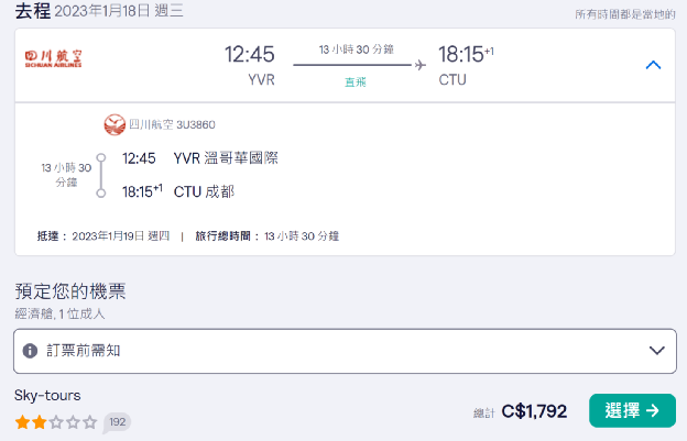 四川航空3U3860 1月18日温哥华-成都,票价$1792加元;