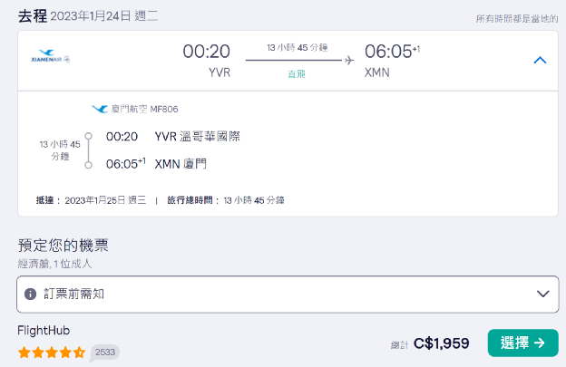 厦门航空MF806 1月24日温哥华-厦门,票价$1959加元。同样,这趟航班也是过年期间回国的航班,大家在选择时需注意这一点。