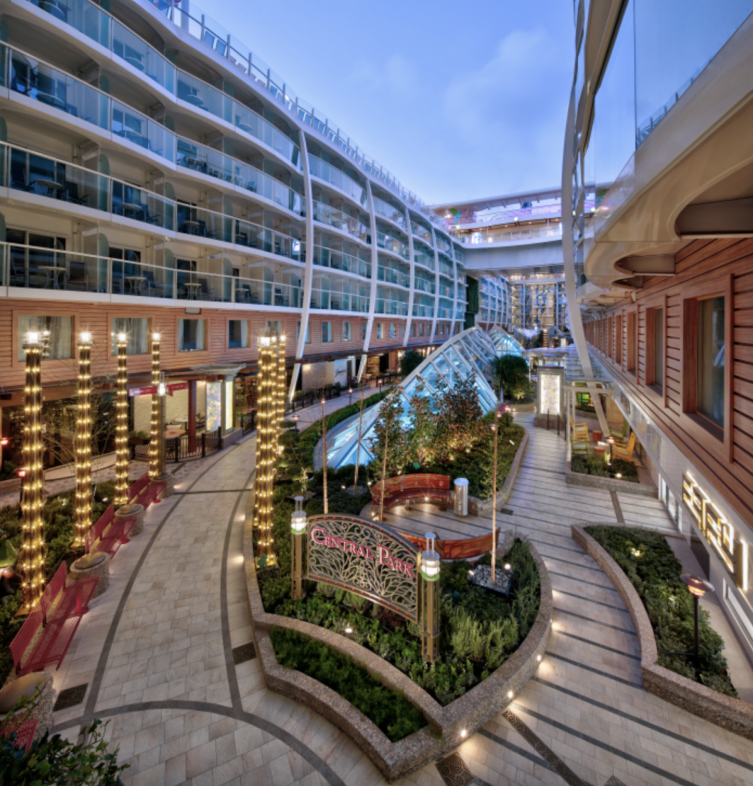 更惊人的是,邮轮上甚至还打造了一座面积巨大的中央公园,真实植物超过了10000株!而这不仅是首例在邮轮上打造的面积巨大的中央花园,而且绿植的数量还破万。