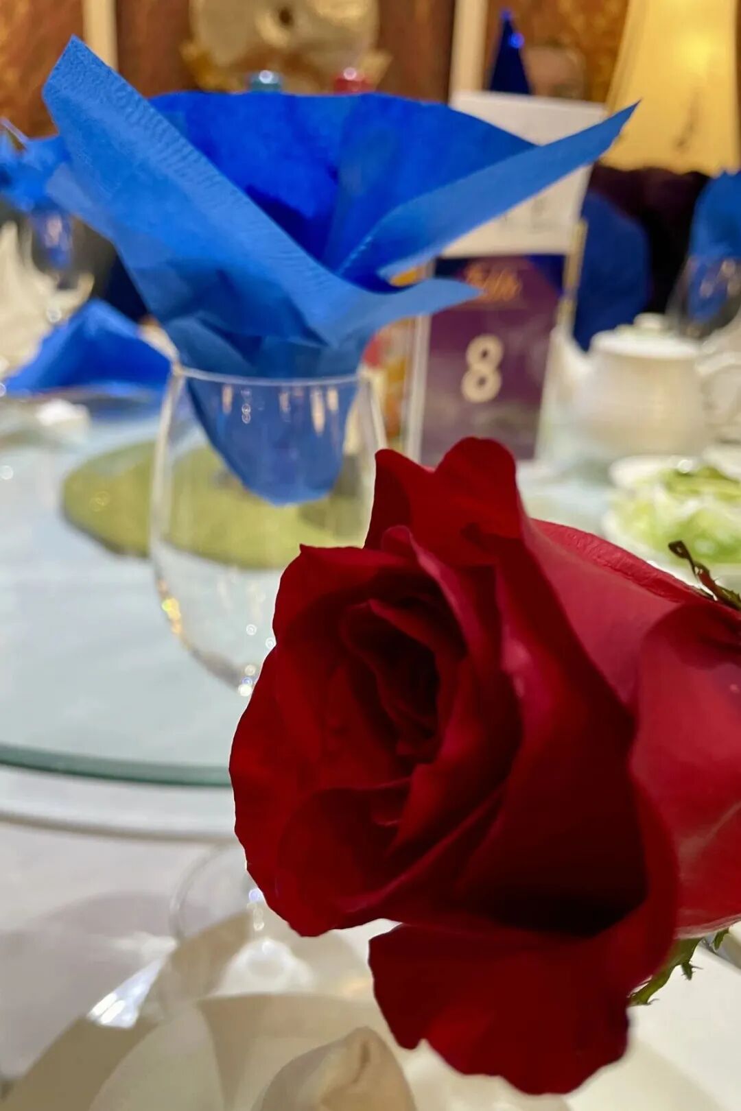与人玫瑰,手有余香。蓝色晚宴的传统是赠与在场的每一位女士一支玫瑰🌹,为宴会增添了一丝浪漫的色彩。