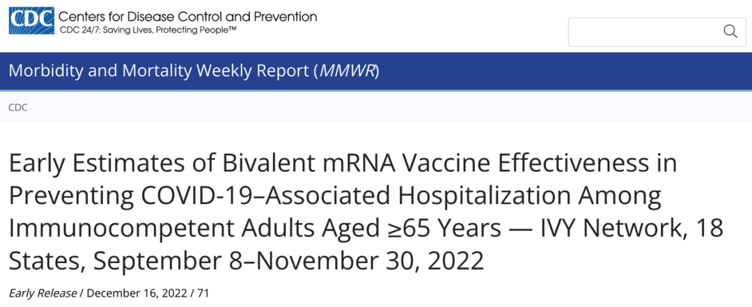 2022年12月16日,美国疾控中心再次发表关键数据,首次给出了二价疫苗在真实世界中的预防住院的有效性。
