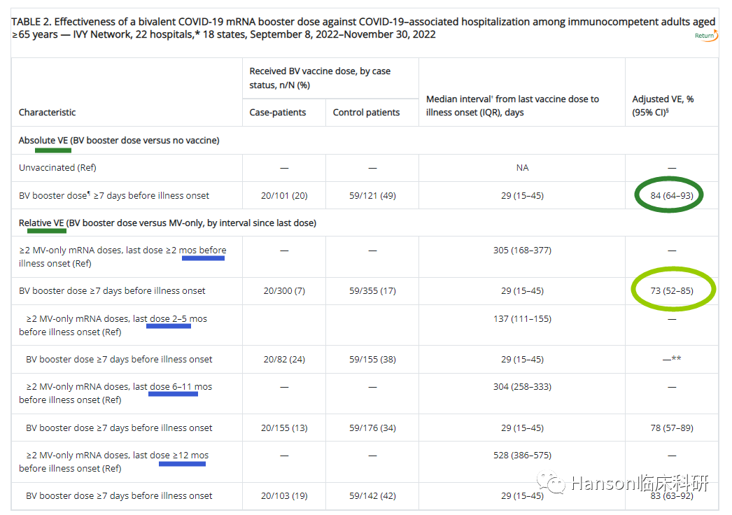 在 2022 年 9 月 8日至 11 月30日期间,美国CDC在18个州的22家医院中,年龄≥65 岁的798例成年人进行了分析。通过比较接受二价加强疫苗与未接受二价加强剂量但≥2 次单价疫苗接种者因COVID住院几率来计算疫苗有效性。